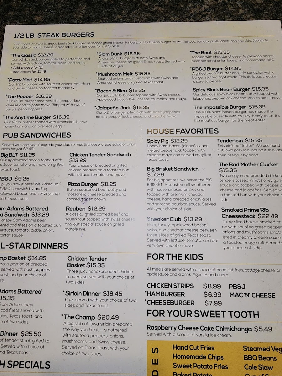 Our 1/2 lb. steak burger grilled to perfection and served with lettuce, tomato, pickle and onion.+ Add cheese for 75¢; Add bacon for $1